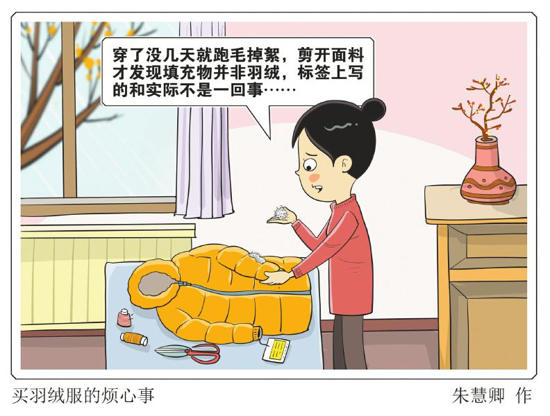 •   近日,“7万余件儿童羽绒服里竟没有真羽绒”的新闻引发消费者关注。穿了没几天就跑毛掉絮,剪开面料才发现填充物并非羽绒,标签上写的和实际不是一回事……这是一些消费者购买羽绒服遇到的烦心事。标签看不懂、内里看不见,消费者如何识别真假羽绒服? 朱慧卿 画