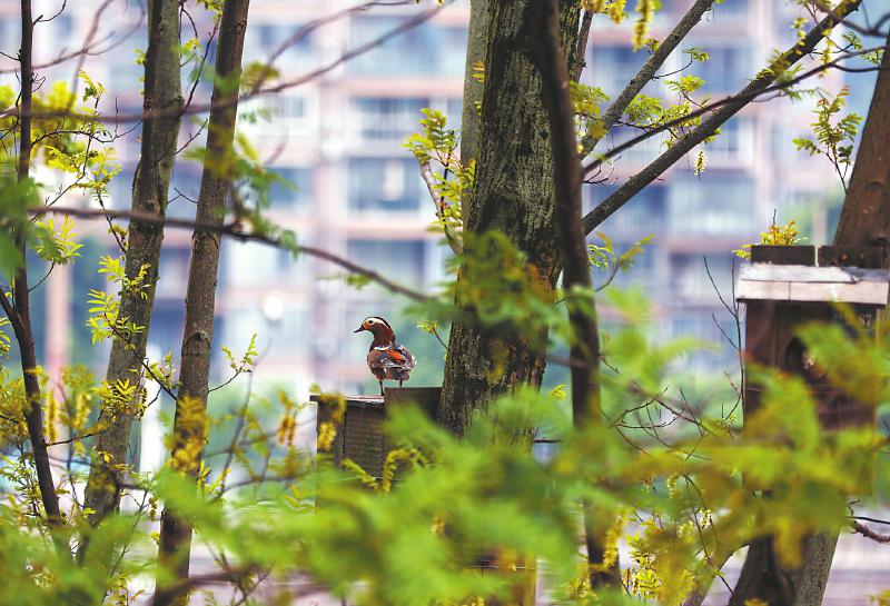 11月13日,一只鸳鸯在雅安市雨城区市中心树上栖息。
