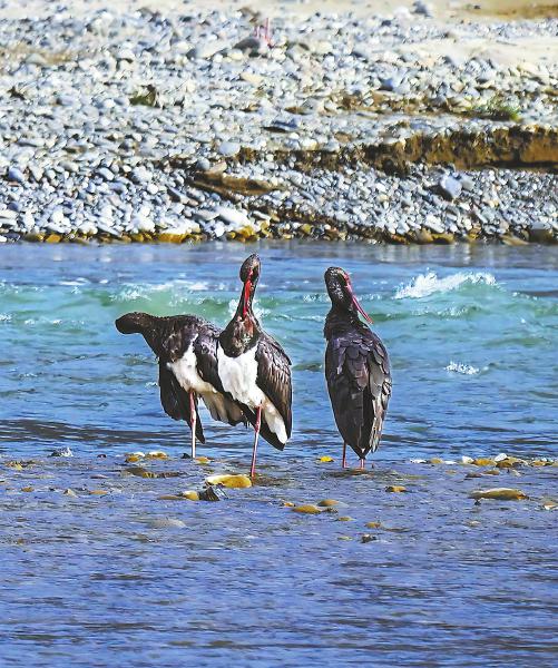 11月6日,被誉为“鸟中大熊猫”的国家一级重点保护野生动物——黑鹳,在甘孜州炉霍鲜水河国家湿地公园悠闲地觅食。
