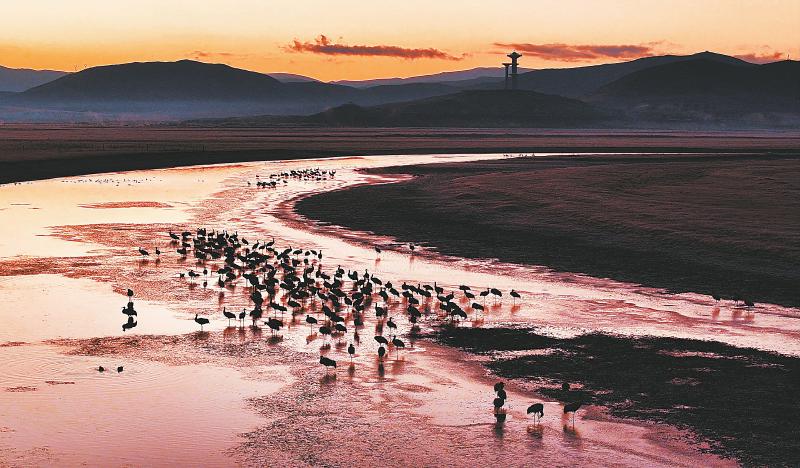 11月29日,数百只准备迁徙的黑颈鹤在阿坝州红原县月亮湾嘎曲河附近驻足。
