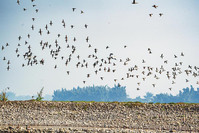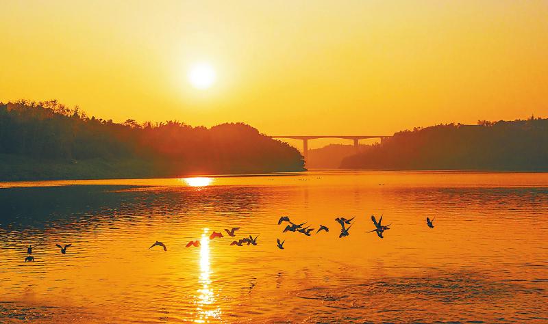 12月1日,一群迁徙的野鸭飞临渠江广安市广安区石笋镇中沙坝水域。