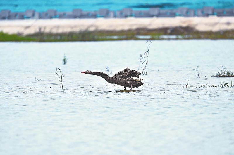 11月26日,一只黑天鹅飞临德阳市旌湖湿地。