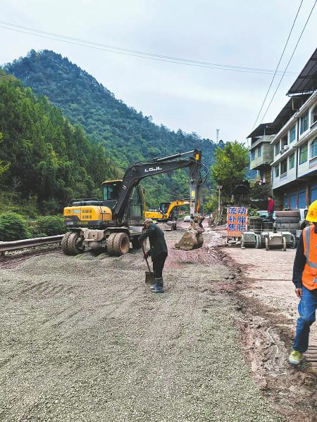 在通江县347国道铁溪段,记者看到不时有装运水泥、钢筋的重型车辆驶过。通江县公路养护管理段的工作人员正在现场进行施工作业,原本坑洼的路面已被碎石块填满,在碎石块上方还铺有一层砂石,在经过压路机的修整后,道路已被压实。