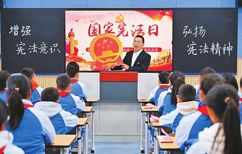 12月2日,在眉山市仁寿县文宫镇小学校,文宫司法所的司法员向学生讲解国徽的组成及宪法知识。12月4日是国家宪法日。连日来,仁寿县各中小学校以多种形式开展“宪法知识进校园”系列活动,通过普及宪法知识、开展主题班会、制作手抄报等形式,弘扬宪法精神,提升学生学法、知法、守法意识。 潘建勇 摄(C视觉)
