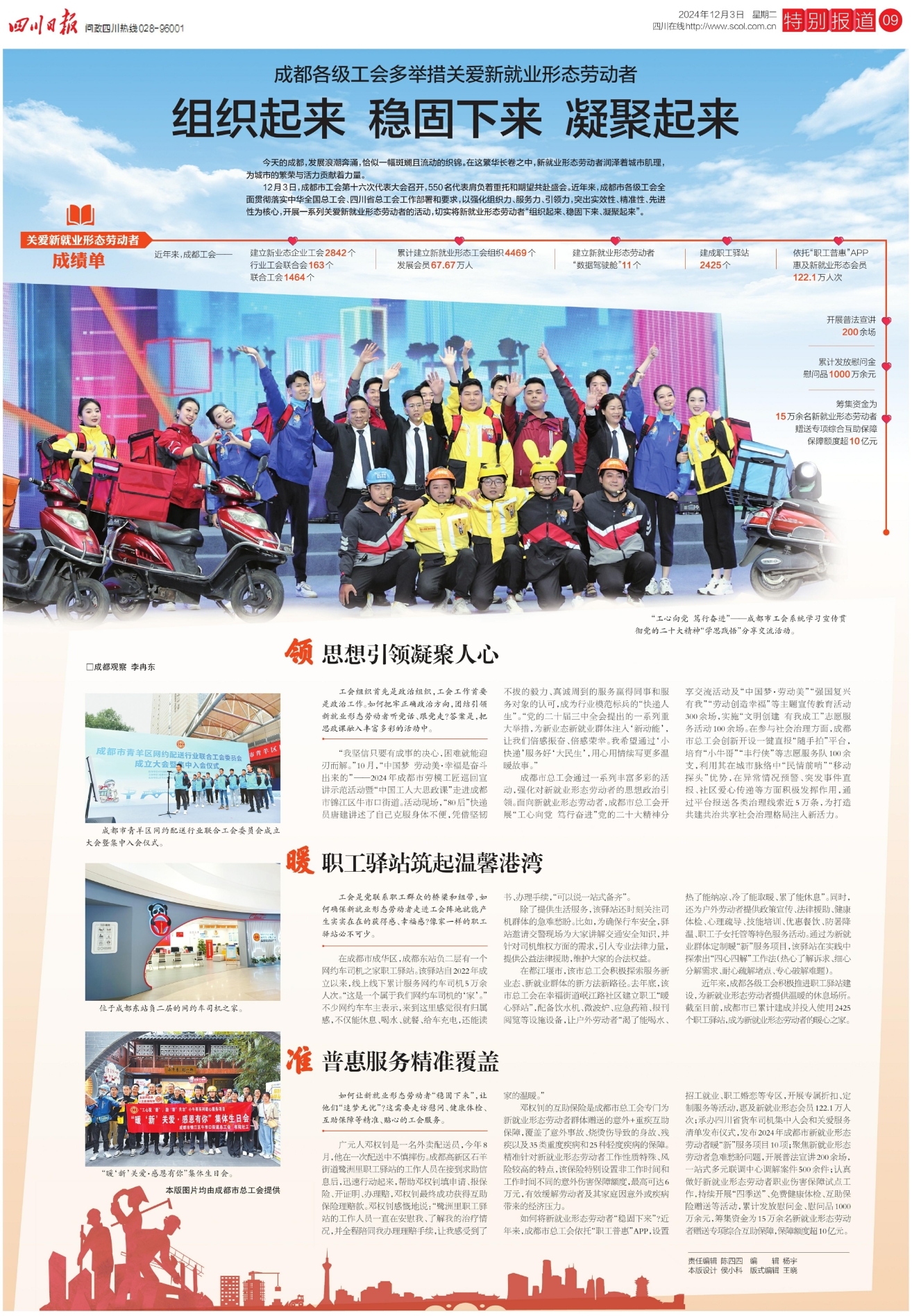 12月3日,成都市工会第十六次代表大会召开,550名代表肩负着重托和期望共赴盛会。近年来,成都市各级工会全面贯彻落实中华全国总工会、四川省总工会工作部署和要求,以强化组织力、服务力、引领力,突出实效性、精准性、先进性为核心,开展一系列关爱新就业形态劳动者的活动,切实将新就业形态劳动者“组织起来、稳固下来、凝聚起来”。
