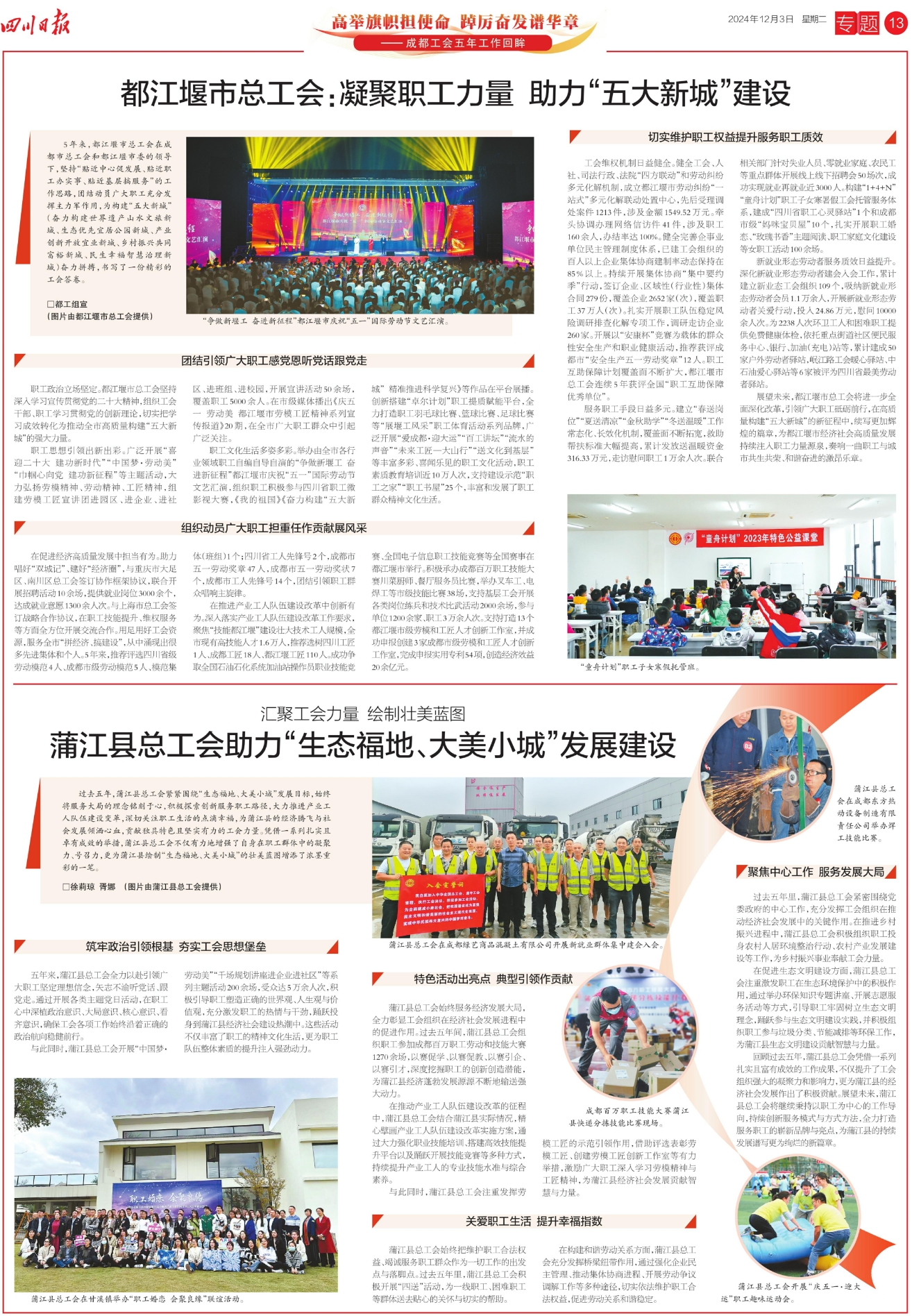 过去五年,蒲江县总工会紧紧围绕“生态福地、大美小城”发展目标,始终将服务大局的理念铭刻于心,积极探索创新服务职工路径,大力推进产业工人队伍建设变革,深切关注职工生活的点滴幸福,为蒲江县的经济腾飞与社会发展倾洒心血,贡献独具特色且坚实有力的工会力量。凭借一系列扎实且卓有成效的举措,蒲江县总工会不仅有力地增强了自身在职工群体中的凝聚力、号召力,更为蒲江县绘制“生态福地、大美小城”的壮美蓝图增添了浓墨重彩的一笔。