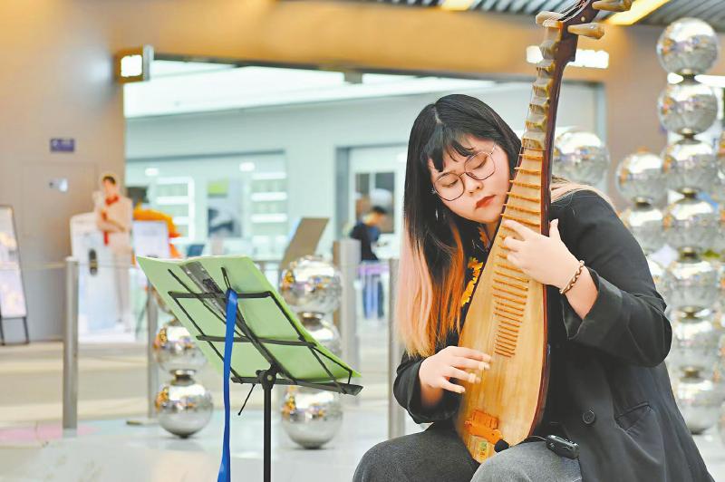 成都街头艺人王贤在华熙LIVE·528演奏琵琶。 成都市文化馆供图