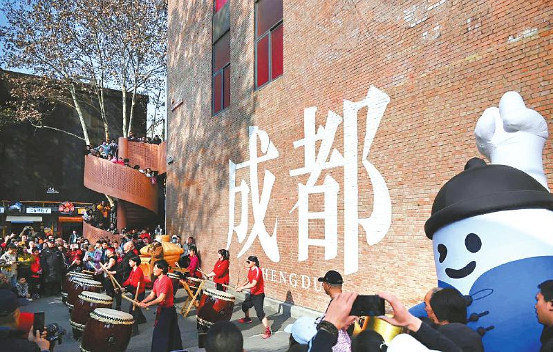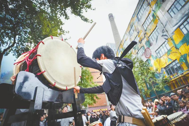 今年大年初一,在写有“成都”二字的红墙下,鼓手们腰间围着外套,精神抖擞。站在中间的鼓手大吼一声,另几位鼓手随声应下,鼓棒在鲜红的牛皮鼓上敲出隆隆声。许多游客循着鼓声而来,不一会儿就里三层外三层地把鼓队“包围”起来,沉浸式体验这一“年味十足”的鼓乐。这是成都“东郊新春HiiKO世界节奏音乐汇”的演出现场,火热程度可见一斑。
