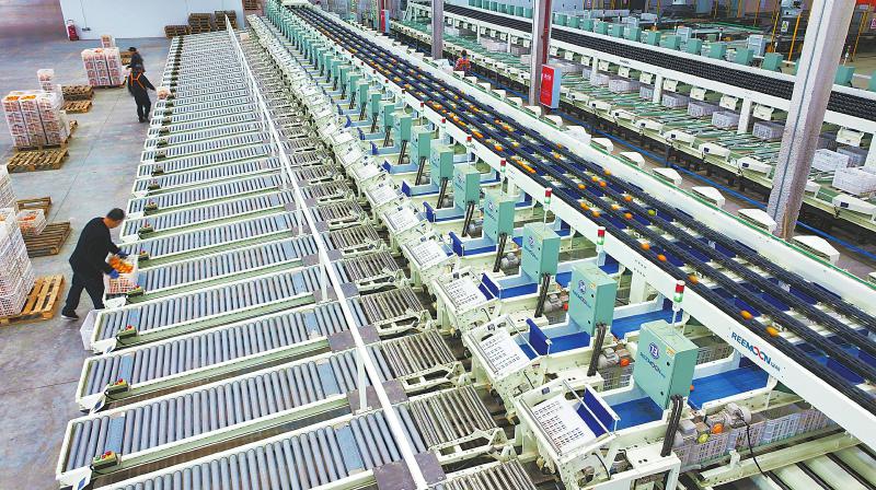 12月6日,在眉山市仁寿县富加镇川果物流中心的水果智能分选车间,工作人员正在分选线上工作。 近年来,眉山市仁寿县建成集仓储、冷链、加工、分选等功能于一体的水果物流配送服务中心。通过智能分选各类时令水果,实现果型、果重、果面干净度和含糖量精准分选,助力当地水果产业提质增效。 潘建勇 摄(C视觉)