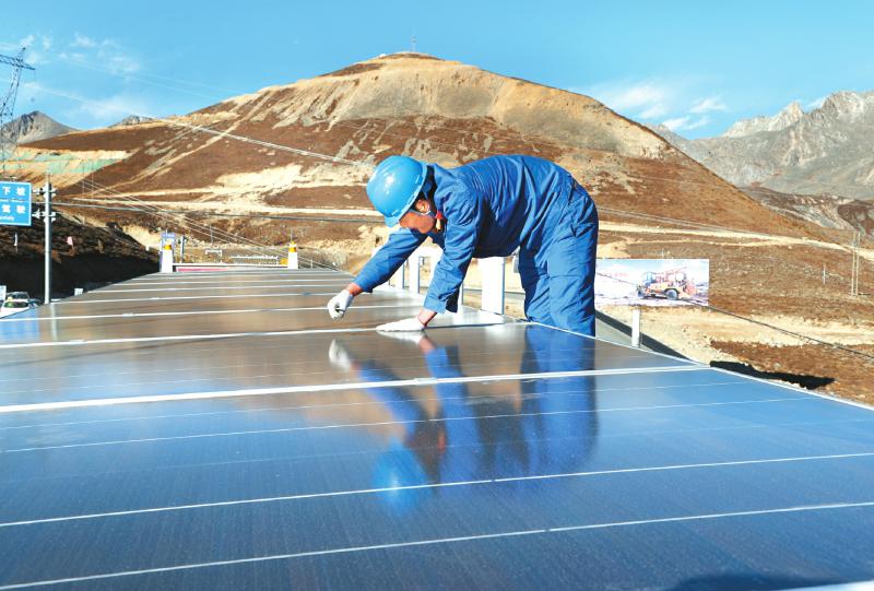工人在川藏绿色驿站屋顶安装通威集团生产的高效太阳能组件。 本版图片均由省光彩事业促进会提供