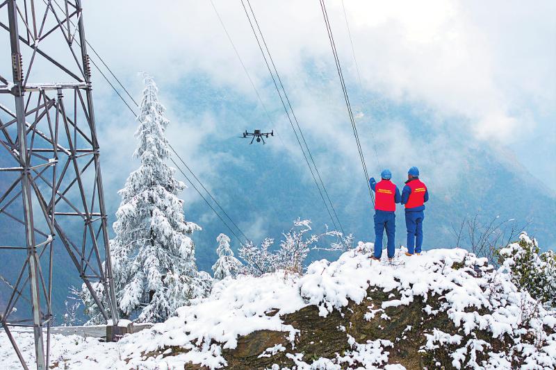 12月10日,受强冷空气影响,绵阳山区迎来了降雪天气。当日,国家电网四川电力(绵阳)连心桥共产党员服务队来到绵阳市北川县擂鼓镇,利用无人机和红外测温仪等设备,对易产生覆冰的220千伏东曲线进行雪后特巡,保障当地电网安全稳定运行。 田海 摄(C视觉)