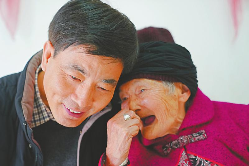 “全国最美退役军人”、汶川县映秀镇渔子溪村党支部书记、村委会主任邹凌(左)看望渔子溪村老人。 裴烈学 摄