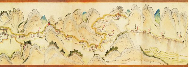 清佚名编绘。该图长672厘米,高31厘米,采用中国传统山水画绘制,以立面的形式详细描绘了道路沿途的自然地形、州县管界、山川桥梁、河水源流、州县城池以及塘铺驿站等军事防护设施,还有寺庙碑刻、亭台牌坊等人文景观。据学者考证,该图绘制的大致时间为清代乾嘉时期。
