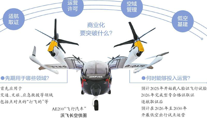 在沃飞长空全球总部基地项目开建现场,记者获悉,沃飞长空预计在2025年开始载人验证飞行试验,在2026年完成型号合格证取证。“我们当前处于研发后期、适航取证中期、商业化前期。”沃飞长空首席市场官费岚说,适航取证后,预计在2026年至2030年开展低空出行试点运营,产品将首先应用于交通、文旅、应急救援等领域,包括点对点的“打飞的”等。