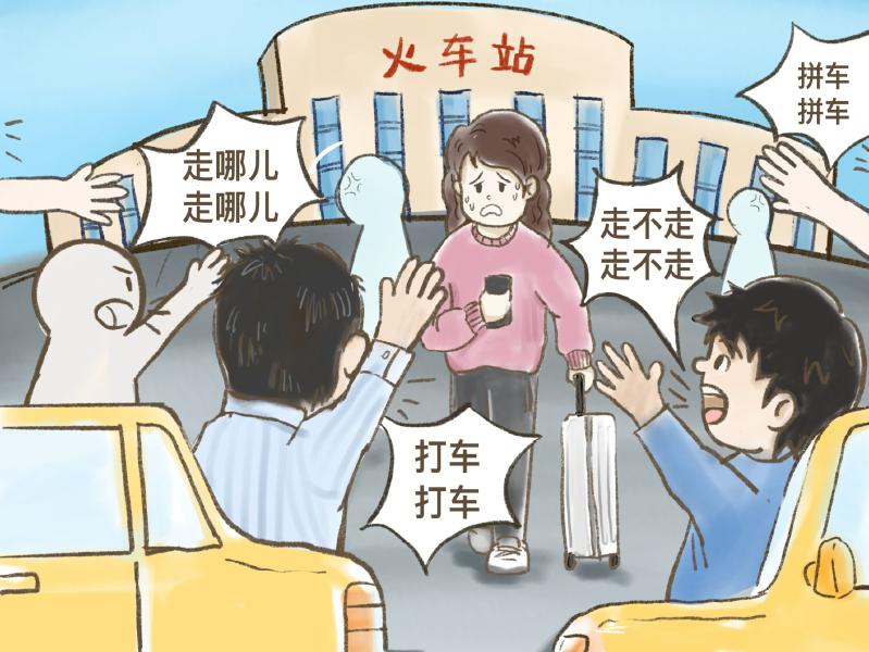 游客被车站外的拉客者“包围”。王瑞瑾 绘