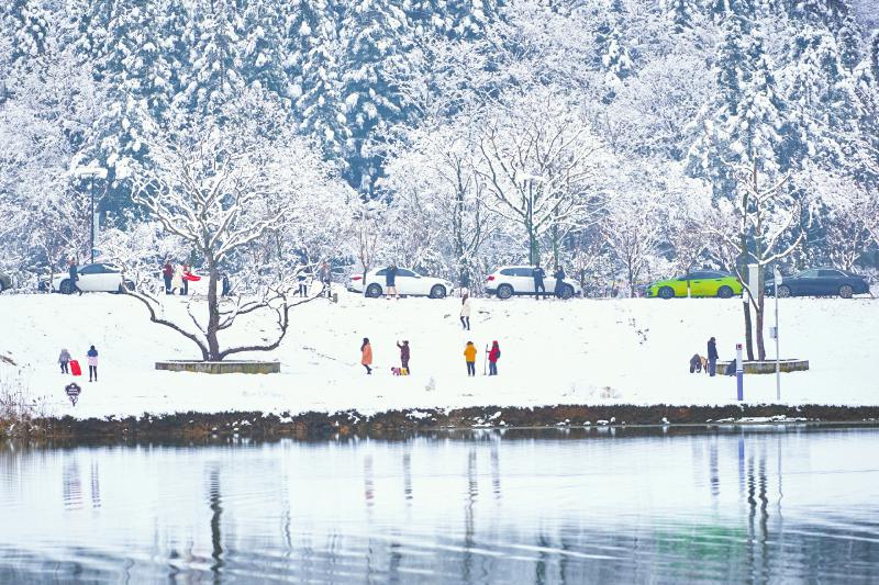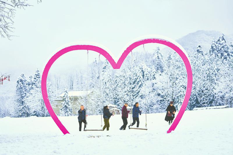 今年冬季,广元市利州区不断丰富冰雪消费产品供给。图为12月6日,游客在利州区白朝乡月坝旅游度假区开发的冬季旅游项目——月坝冰雪嘉年华赏雪、玩雪。 罗晓平 摄