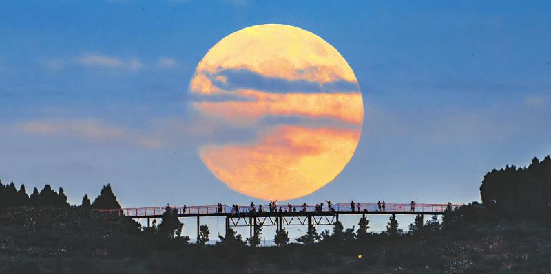 8月18日 19点25分,“超级月亮”从成都市龙泉山彩虹观景桥升起,市民、游客们纷纷与“超级月亮”合影。