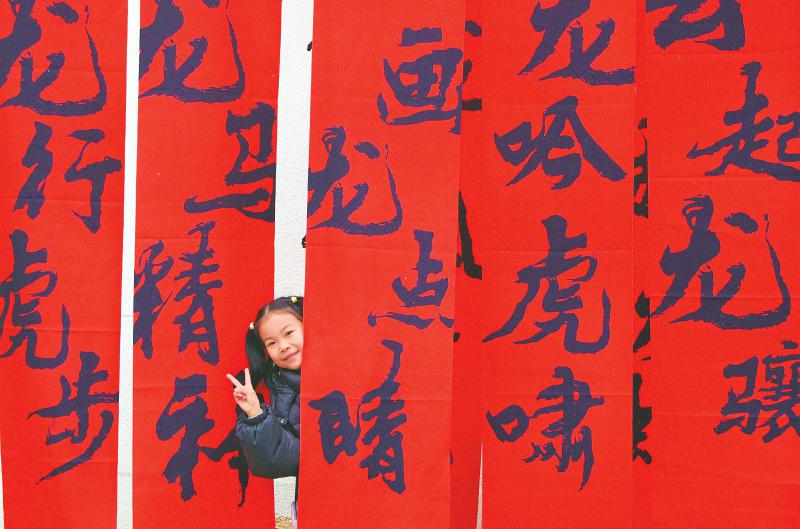 1月27日 龙年春节前夕,成都东郊记忆四处洋溢着新春的喜庆氛围。一位小女孩在挂满龙年成语的条幅间打卡拍照,露出可爱的笑颜。