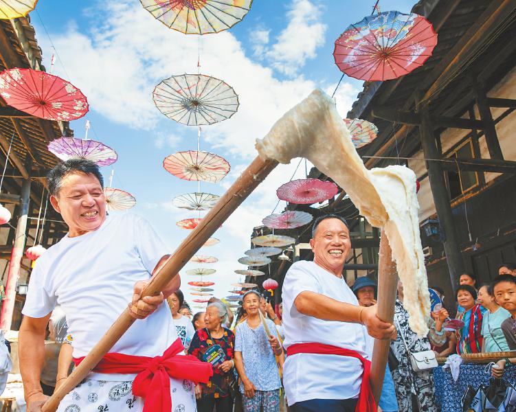 9月15日 中秋小长假第一天,广安市广安区肖溪镇在老街上举行传统活动“舂糍粑”喜迎中秋佳节。