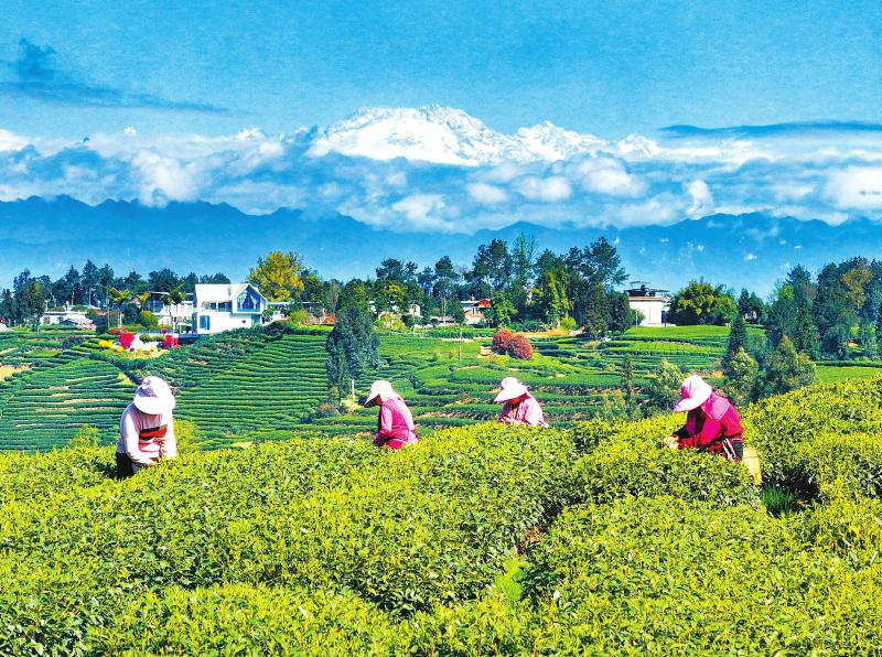 3月25日 雨后初晴的雅安市名山区红星镇茶园,远处雪山皑皑,茶农趁着晴好天气采摘春茶。