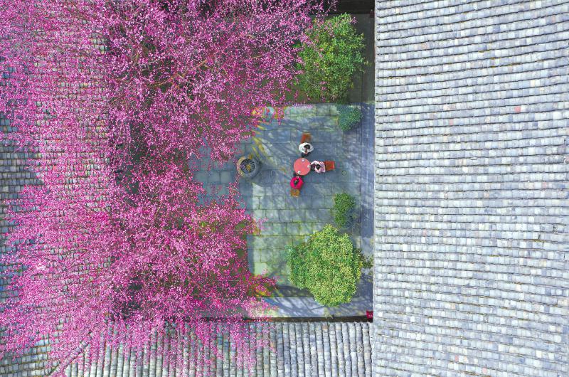 2月21日 南充市阆中古城内的院落里红梅盛开,游人在树下品茗赏花,享受惬意的暖阳。