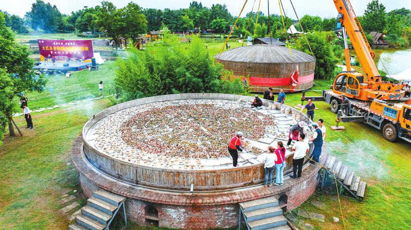 6月8日 端午前夕,成都市大邑县稻乡渔歌现代农业产业园,高6米、直径11米的竹编“天府一锅蒸”首次开锅,一次性蒸煮了1万个粽子。