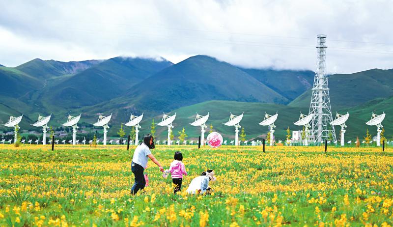 7月22日 甘孜州稻城县,圆环阵太阳射电成像望远镜如一颗巨大的“千眼天珠”镶嵌在高原草地上,壮美如画,引来众多游人打卡。