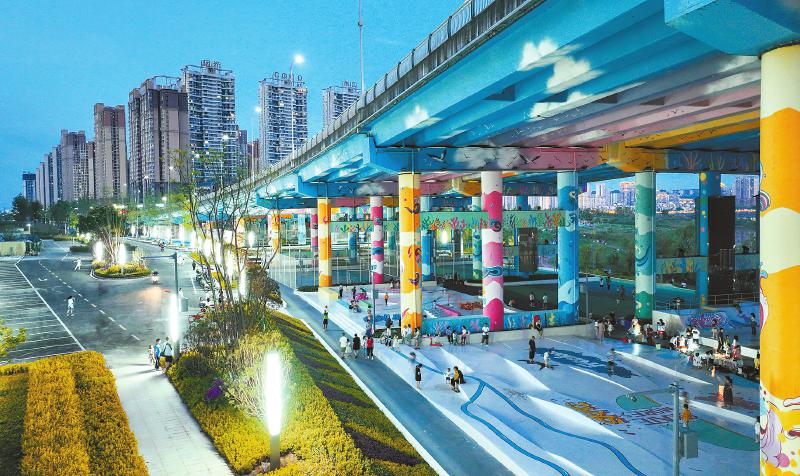 5月26日 南充市顺庆区清泉坝桥下,市民们在“嘉陵绿浪”体育空间健身游玩。这里曾是荒芜的滩地,如今变身为绿道新亮点。