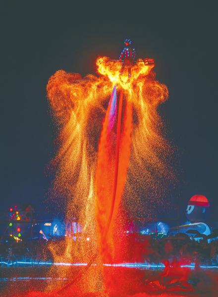 10月6日 成都蔚然花海上演了一场精彩的火壶表演。表演者精准地利用水柱在空中操控火壶,火焰随之舞动,宛若一只展翅高飞的“凤凰”。