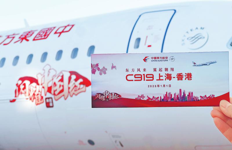 1月1日,东航工作人员在C919执飞的MU721航班前展示纪念机票。 2025年1月1日,新年第一天,由东航C919执飞的MU721“上海虹桥—香港”定期商业航班开航。这是国产大飞机C919首次执飞沪港定期商业航班,正式开启地区航线商业运营。 新华社发(东方航空供图)