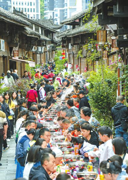2024年12月29日,旺苍摆下长桌宴喜迎元旦佳节,热辣滚烫的酸辣粉、品类丰富的全牛宴等特色美食,吸引不少游客体验。2024年以来,旺苍县紧抓茶博会、啤酒节、旅游节及年货节等契机,精心策划举办了10余场次的饮食体验活动,共计吸引游客超过15.8万人次。 陈加普 摄