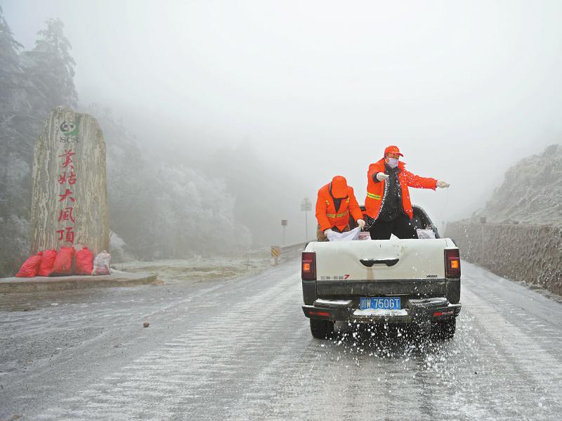 1月7日,在国道348线美姑县洪溪至瓦候路段大风顶自然保护区,路面出现不同程度的积雪结冰现象。为了保障来往车辆安全,美姑县公路养护中心组织应急队伍携带工业盐,驱车奔赴现场,对长下坡、急弯、桥梁和阴坡等约5公里的高危路面抛撒工业盐实施除冰作业,最大限度地降低雨雪天气对交通出行的影响。 吉木木且 摄(C视觉)