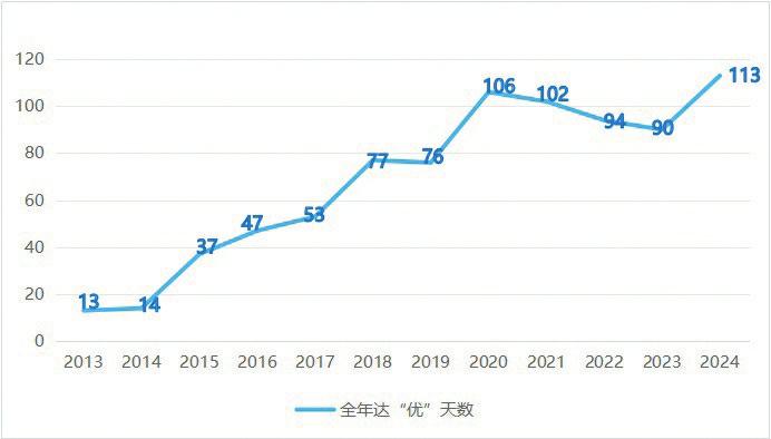 自2013年我国开始实施环境空气质量新标准以来,成都市空气质量持续改善。2024年,成都市PM2.5浓度为32微克每立方米,首次达到国家环境空气质量二级标准,为2013年以来最优;空气质量优良天数295天,同比增加10天,其中最高等级“优”的天数大幅增加至113天,为2013年以来最多;全年空气质量综合指数在全国168个重点城市中排第52位,同比提高39位,达到历史最高排名。