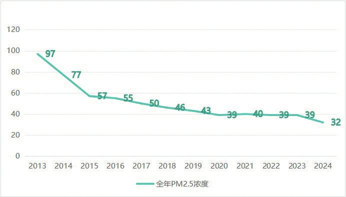 2013年起,成都市开始实施环境空气质量新标准,全市PM2.5浓度呈逐年递减趋势,2024年降至32微克每立方米,下降比例达67%。