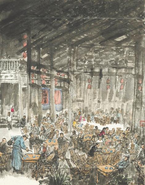 茶馆是四川市井生活、乡土文化的一面镜子,常常出现在文艺作品中,映照出独特的巴蜀气韵和川人精神。这幅《罗城·茶馆》,是乐山画家杨循描绘家乡风物和乡土生活的佳作。杨循的画风工写兼备,细腻而奔放。他的工笔人物画线条精致,色彩丰富,对人物刻画入微;写意人物画则笔墨酣畅,气韵生动,展现出独特的艺术魅力。作品中既有对古代题材的描绘,充满传统文化之精神;又有对现实生活题材的呈现,展示出鲜活而生动的生活画卷。《罗城·茶馆》这样的作品,展现了艺术家对传统文化的深入研究和传承,也体现了对现代生活的敏锐观察和独特见解。 (余如波)