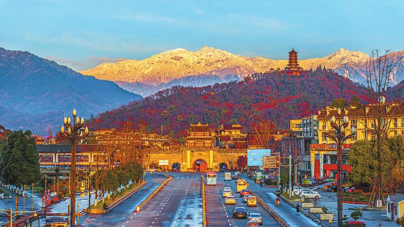 1月11日,初升的太阳映照着远处的雪山,也给都江堰古城镀上一层金辉,雪山和古城仿佛融为了一体。 马川江 摄(C视觉)