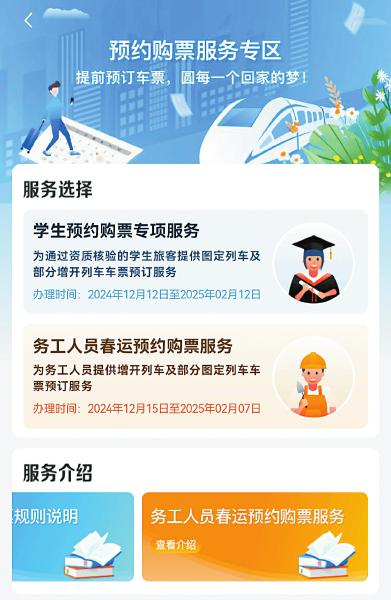 此外,记者从“12306”App上也查询到,今年春运上线了“务工人员春运预约购票服务”,通过实名认证的务工人员可在专区预约购买2025年2月23日以前的火车票,同一账户最多可同时提交3个订单,每个订单可添加1个乘车日期的5个“车次+席别”的组合,最多可为包含本人在内的9名旅客预约。