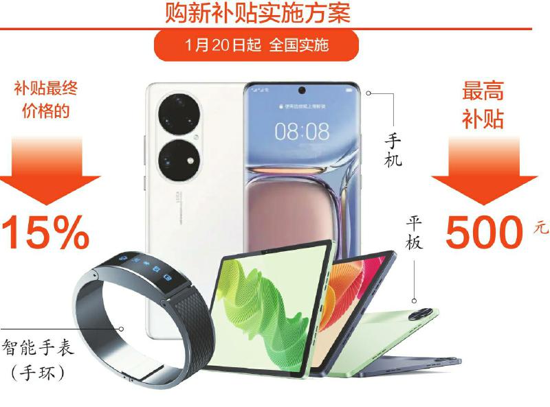 手机、平板、智能手表(手环)购新补贴实施方案明确,个人消费者购买单件销售价格不超过6000元的手机、平板、智能手表(手环)3类数码产品,可享受购新补贴。每人每类可补贴1件,每件补贴比例为减去生产、流通环节及移动运营商所有优惠后最终销售价格的15%,每件最高不超过500元。各地将根据该方案细化实施细则,1月20日起全国实施。