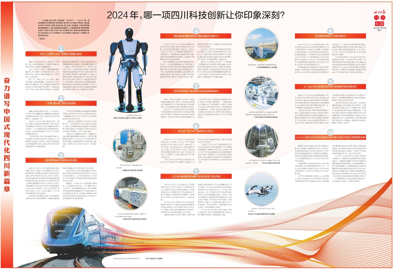 人工智能、量子科技、宇宙起源、“飞行汽车”……2024年,哪一项科技创新让你印象深刻?科技创新,催生新产业、新模式、新动能,是发展新质生产力的核心要素。新年伊始,四川日报·川观新闻、中国科学院成都文献情报中心、四川省创新驱动发展中心、长城战略咨询、雨前顾问联合组织了由院士领衔,科研人员、科技智库专家、媒体专家组成的专家团,共同推荐出2024年度四川十大科技新闻,回望过去一年间四川科技的高光时刻。