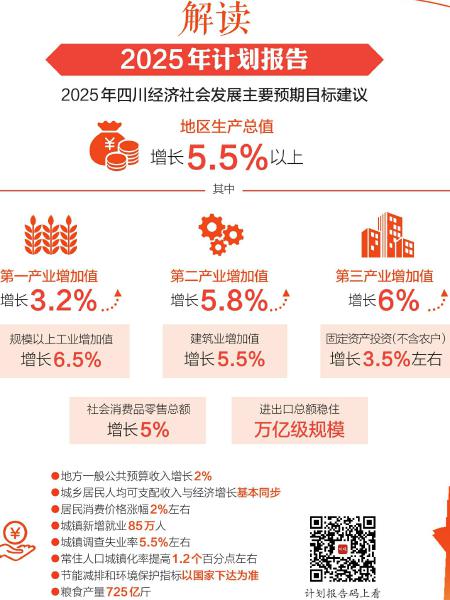 1月20日,省十四届人大四次会议在成都开幕。省发展改革委作了《关于四川省2024年国民经济和社会发展计划执行情况及2025年计划草案的报告》(以下简称《计划报告》),提出2025年度各项计划安排建议,其中包括地区生产总值增长5.5%以上的预期目标建议等。