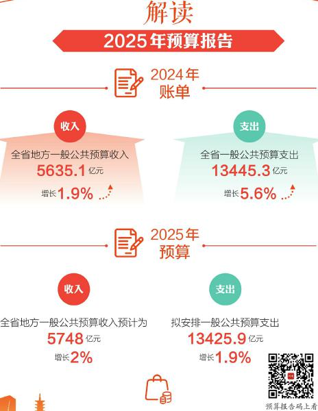 根据《预算报告》,2025年,全省地方一般公共预算收入预计为5748亿元,增长2%;拟安排一般公共预算支出13425.9亿元,增长1.9%。