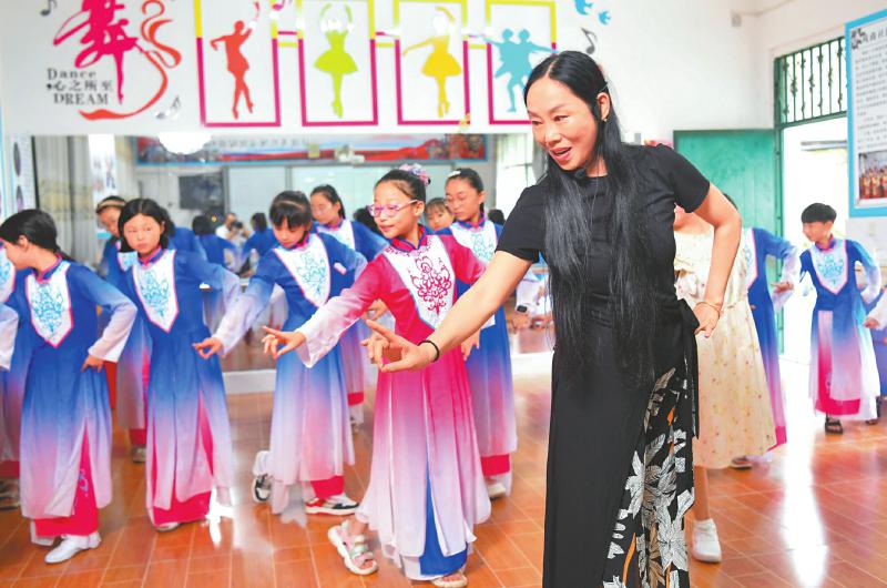 2024年7月4日,在南充市蓬安县相如第一小学校,孩子们在川剧老师的指导下练习川剧表演。
