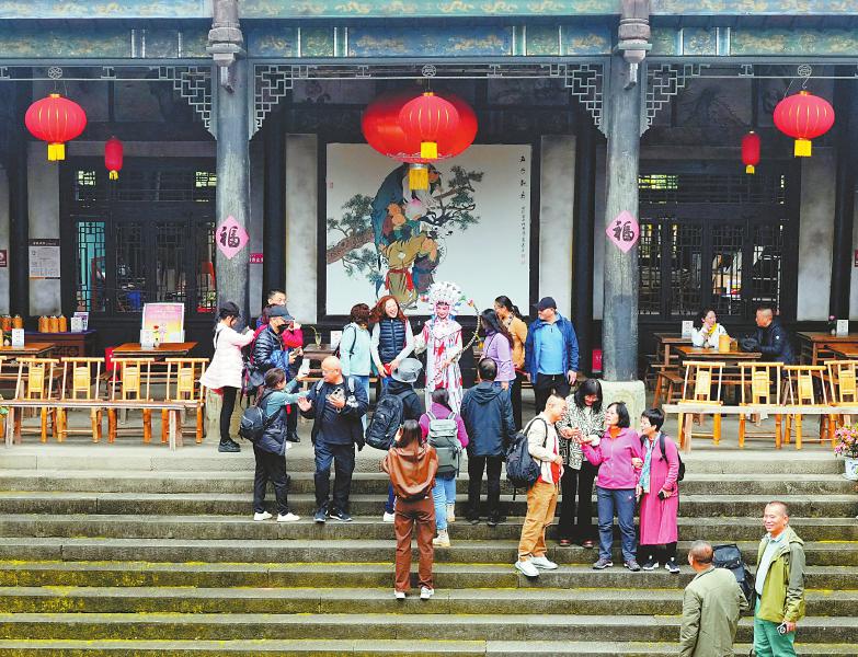 2024年11月7日,巴中市恩阳古镇万寿宫民俗剧场,观众邀请川剧演员走下舞台一起拍照留念。
