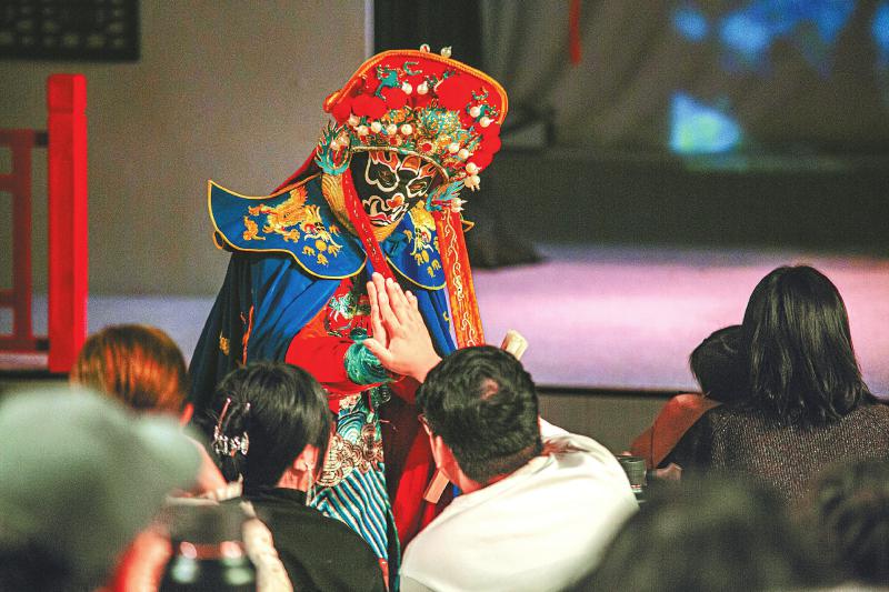 2024年12月21日,观众在成都东郊记忆繁星戏剧村观看演出。图为新川剧《嘿!白娘子》的变脸演员与台下观众互动。