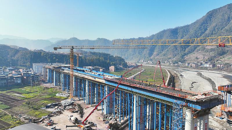 1月16日,西渝高铁康渝段站前四标樊哙站1号六线特大桥正加快施工,为全线贯通打下坚实基础。 中铁六局西渝高铁康渝项目部供图