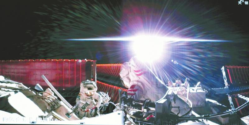 1月20日在北京航天飞行控制中心拍摄的神舟十九号航天员蔡旭哲(右)、宋令东(左)在空间站组合体舱外工作的画面。 新华社记者 刘芳 摄