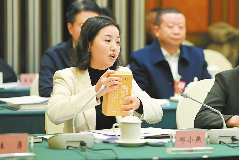 邓小燕代表拿出家乡的“东宝贡”有机大米,围绕打造新时代更高水平“天府粮仓”、确保粮油安全进行发言。