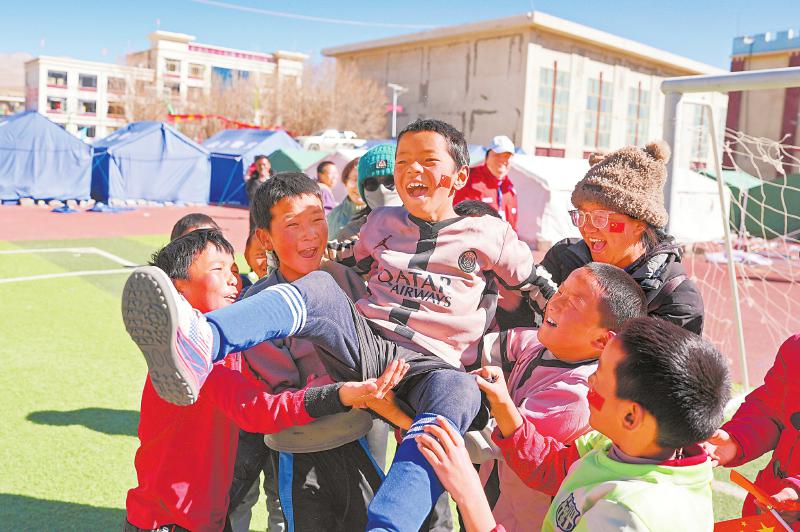 1月26日,定日县曲洛乡完全小学操场上,长所乡嘎旦村“勇往直前”队守门员旦增罗布(上)被队友抛起庆祝。 西藏定日6.8级地震发生20天后,灾区震后安置工作正有条不紊地进行着。在春节即将到来之际,中国科学院心理研究所联合其他相关机构为长所乡嘎旦村和曲洛乡措昂村的孩子们精心组织了一场地震灾区的足球比赛。这场足球比赛让孩子们感受到运动的快乐,也为他们的心理重建和健康成长注入新的活力。 新华社记者 晋美多吉 摄