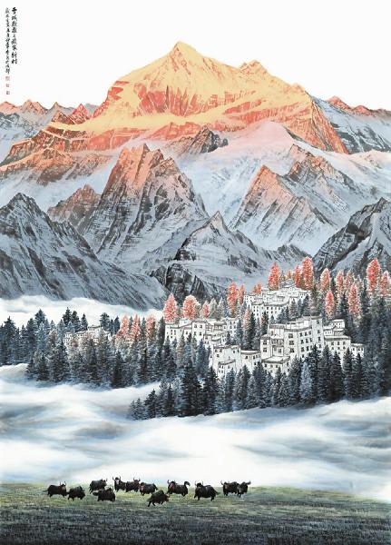 四川画家李兵对高原雪山情有独钟,其作品拓展了中国水墨雪景山水画的创作题材,推动了雪景绘画艺术在体现物象质感和动感上的进步。正如评论者所言,李兵探究出了“块斧劈皴”笔墨技法和“挤白”“衬白”染雪法,通过笔触和色墨在纸上留下的痕迹,将高原地区因冰川冻土而形成的肃穆刚劲感、高寒积雪因风吹而形成的流动感,以及高原雪山因太阳运动而带来的光感表现得淋漓尽致。当李兵将圣洁、雄浑、巍峨、壮美等气象艺术地呈现于画面中时,他想传达的不仅是高原雪山坚韧不拔、昂扬向上的脊梁风貌,更是一种雄强无畏、兼济天下的精神气魄。 (余如波)