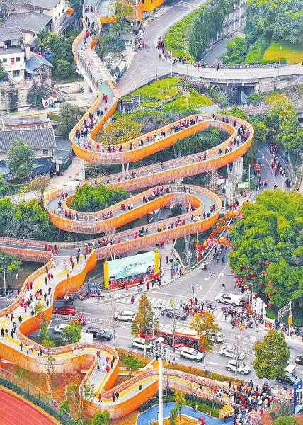 1月29日,宜宾市翠屏区翠屏山城市森林公园,市民漫步蛇形栈道,登高迎新。兰锋 摄(C视觉)
